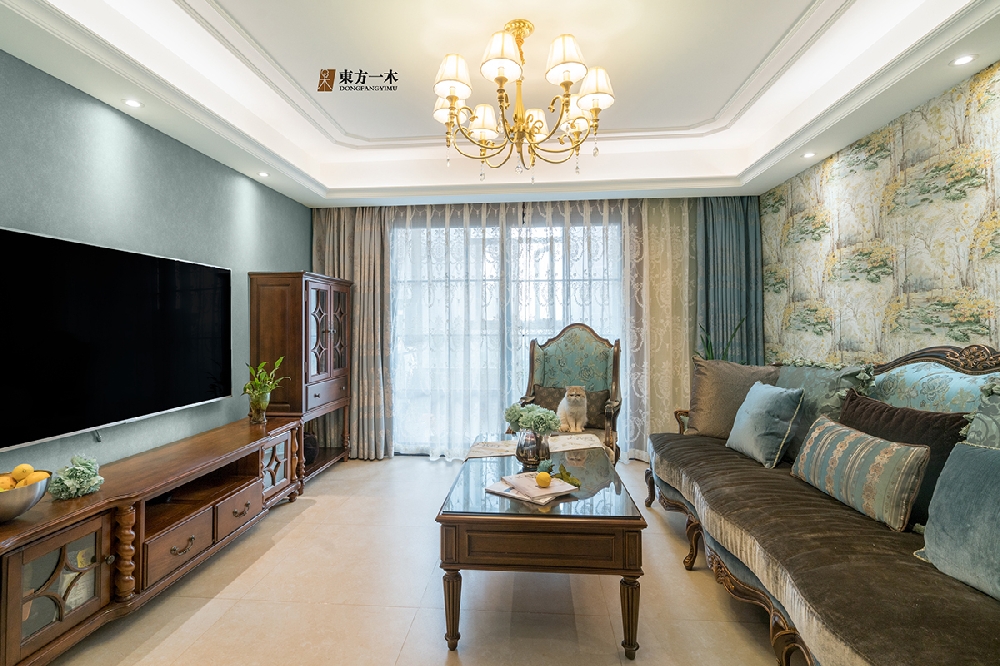 主卧是浓浓的古典美式风。做旧复古的家具摆件,家具造型、纹路、雕饰和色调细腻高贵,透露亘古而久远的气息。