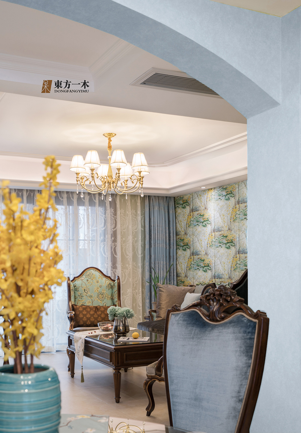 从餐厅看客厅,餐厅和客厅之间用拱门造型划分。仿古老式的美式沙发椅,带有岁月的沧桑。厚重的家具,突出了生活的舒适和自由。