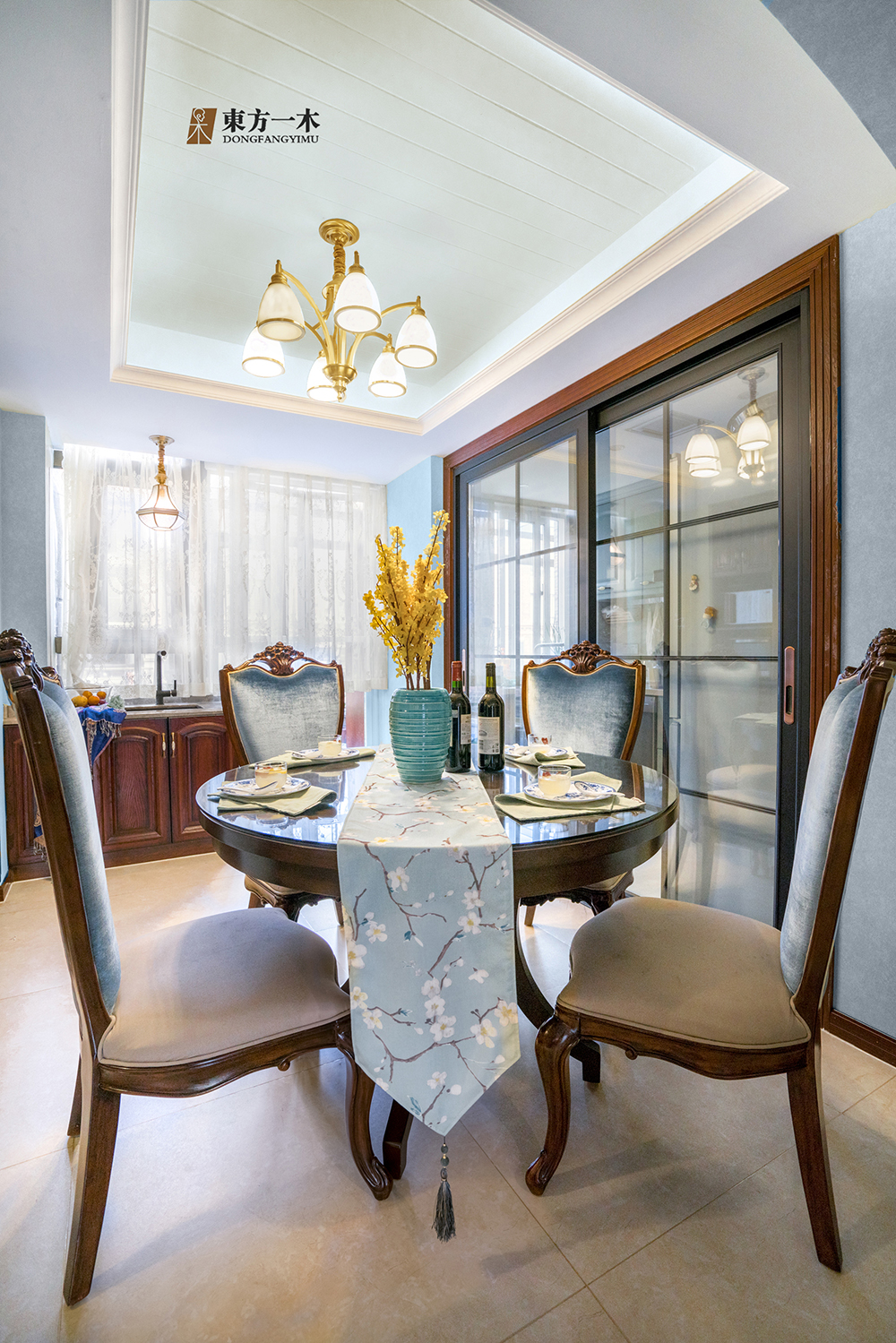 餐厅设计了餐边柜加水池,使用自然木质柜体和砖砌成的柜台,制造出美式乡村别样的小餐吧。代替了厨房的部分功能,方便使用。还可作为简易的西厨使用。